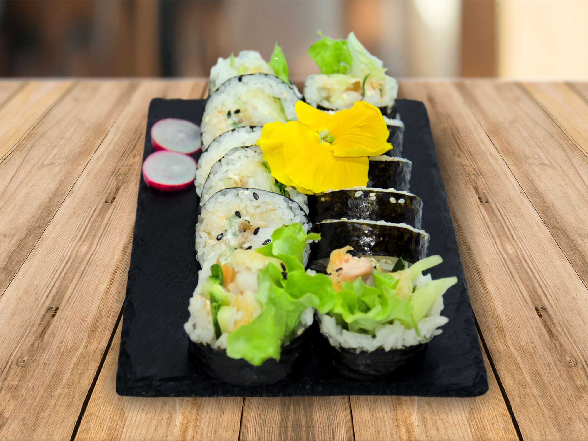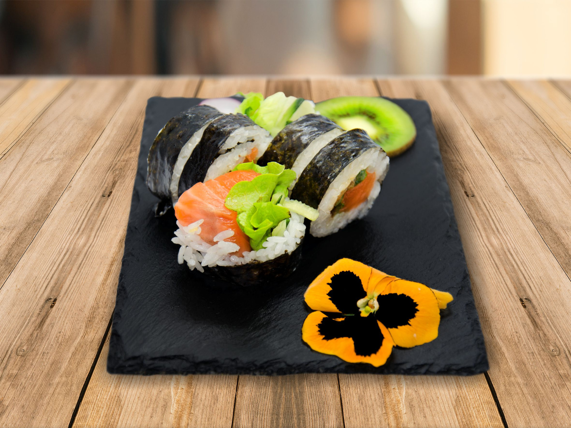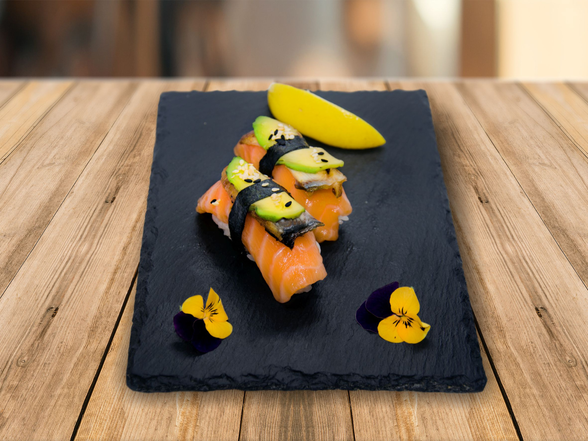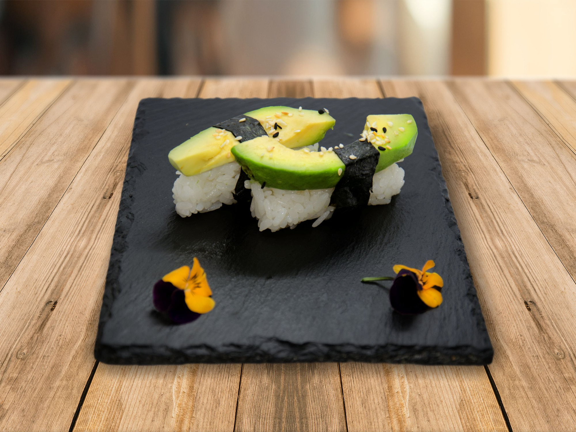 Kulka ryżu przykryta slicem ryby, owocem morza, warzywem lub owocem. Podawane po 2 szt